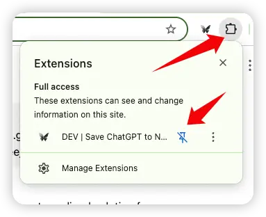 After installing the extension, we recommend pinning the extension icon to your browser toolbar for easy access. Click the puzzle piece icon in your browser toolbar, find the ChatGPT to Notion extension, and click the pin icon.