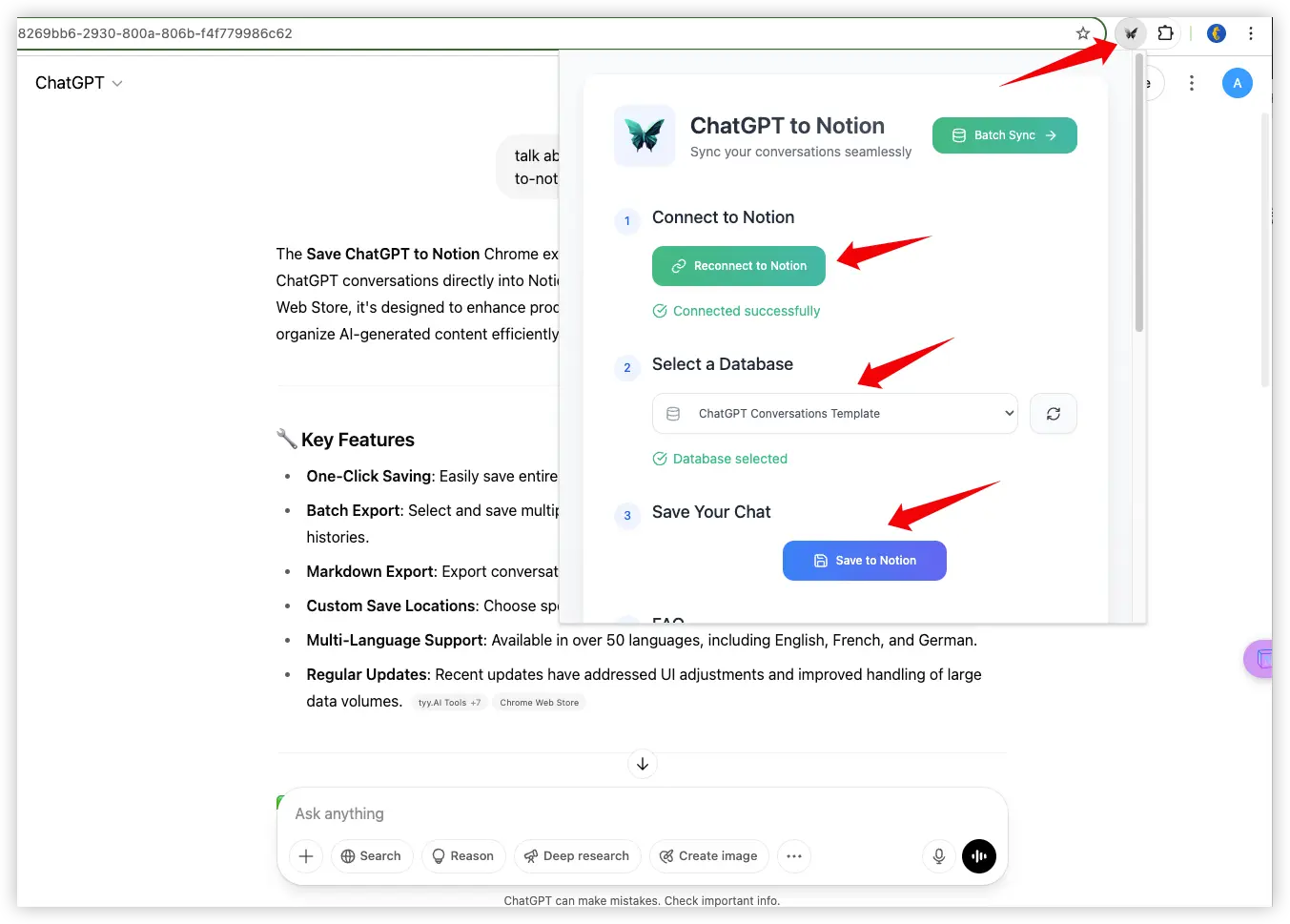 Before you can start saving your ChatGPT conversations to Notion, you'll need to complete a one-time authorization process. After authorization, you can save conversations with just a single click.